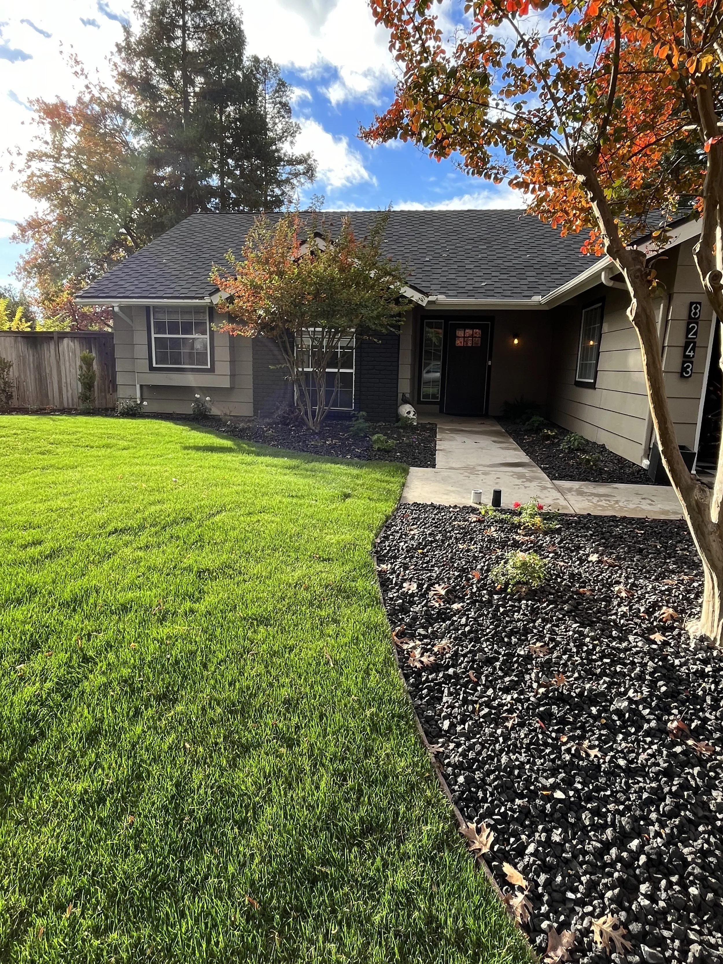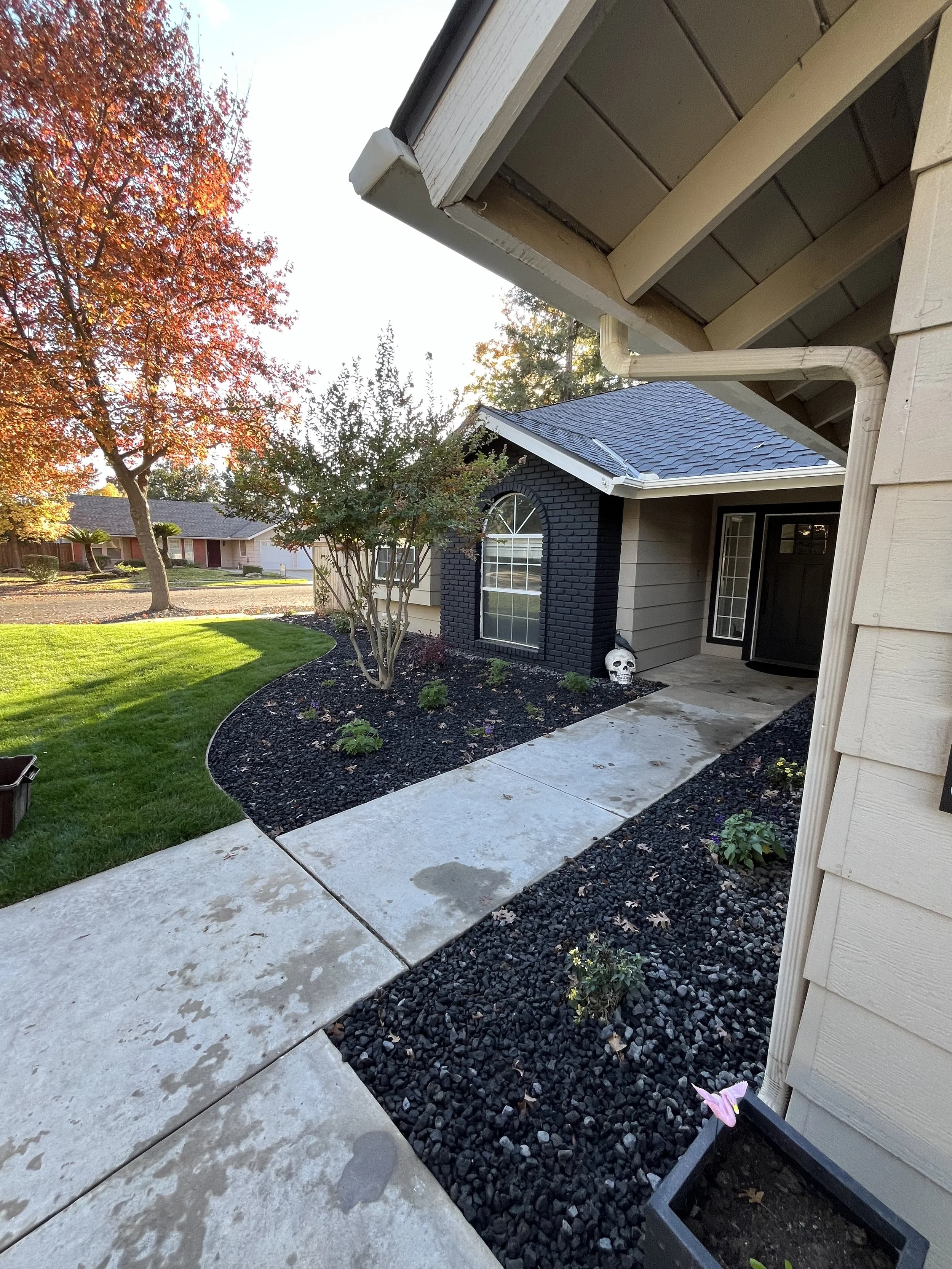 When we decided to redo our landscaping we considered our individual style and wanted our home to stand out from the others on our street. We also knew we wanted real grass and, of course, my favorite color black had to be incorporated. In addition to ripping out all of the old landscaping we also took the opportunity to paint the old bricks and our garage doors black to give the front a modern feel and really push the landscape forward - highlighting all of the beautiful colors in the plants and trees we chose. We also remove the shutters and replaced the front door with a black one! I’m in love and as everything continues to grow and mature it keeps getting better.