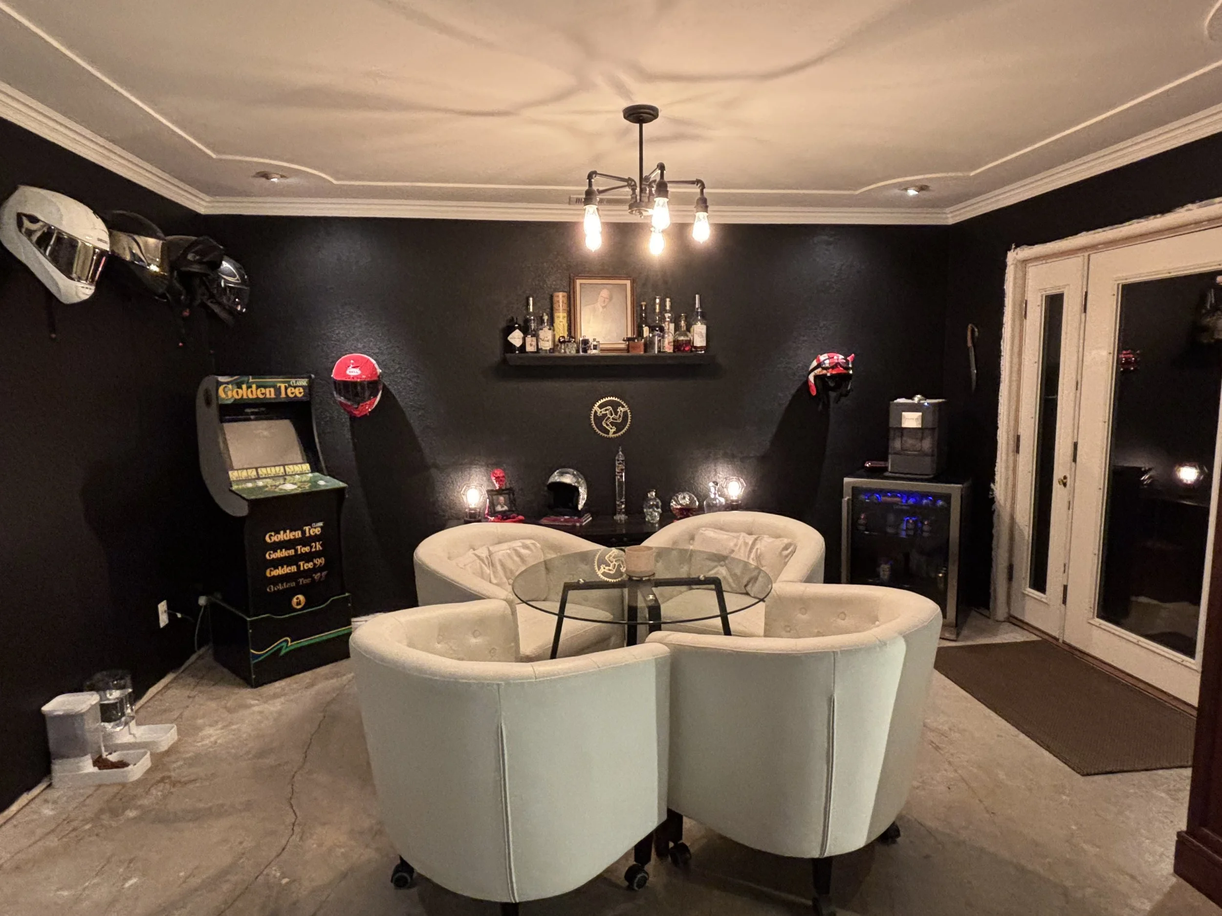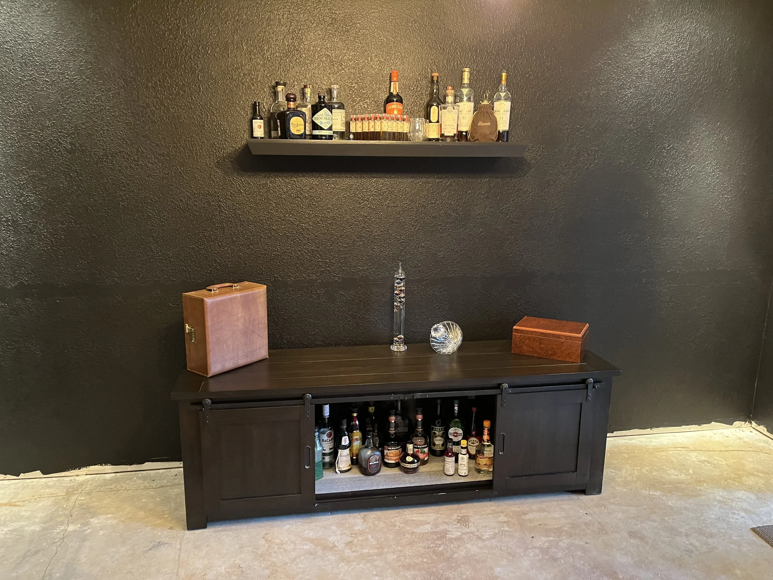 Fresh paint, new furniture, floating liquor shelf, and a beverage refrigerator are surrounded by our motorcycle helmets which are stylish and functional aspects of the overall style and design we were aiming for.