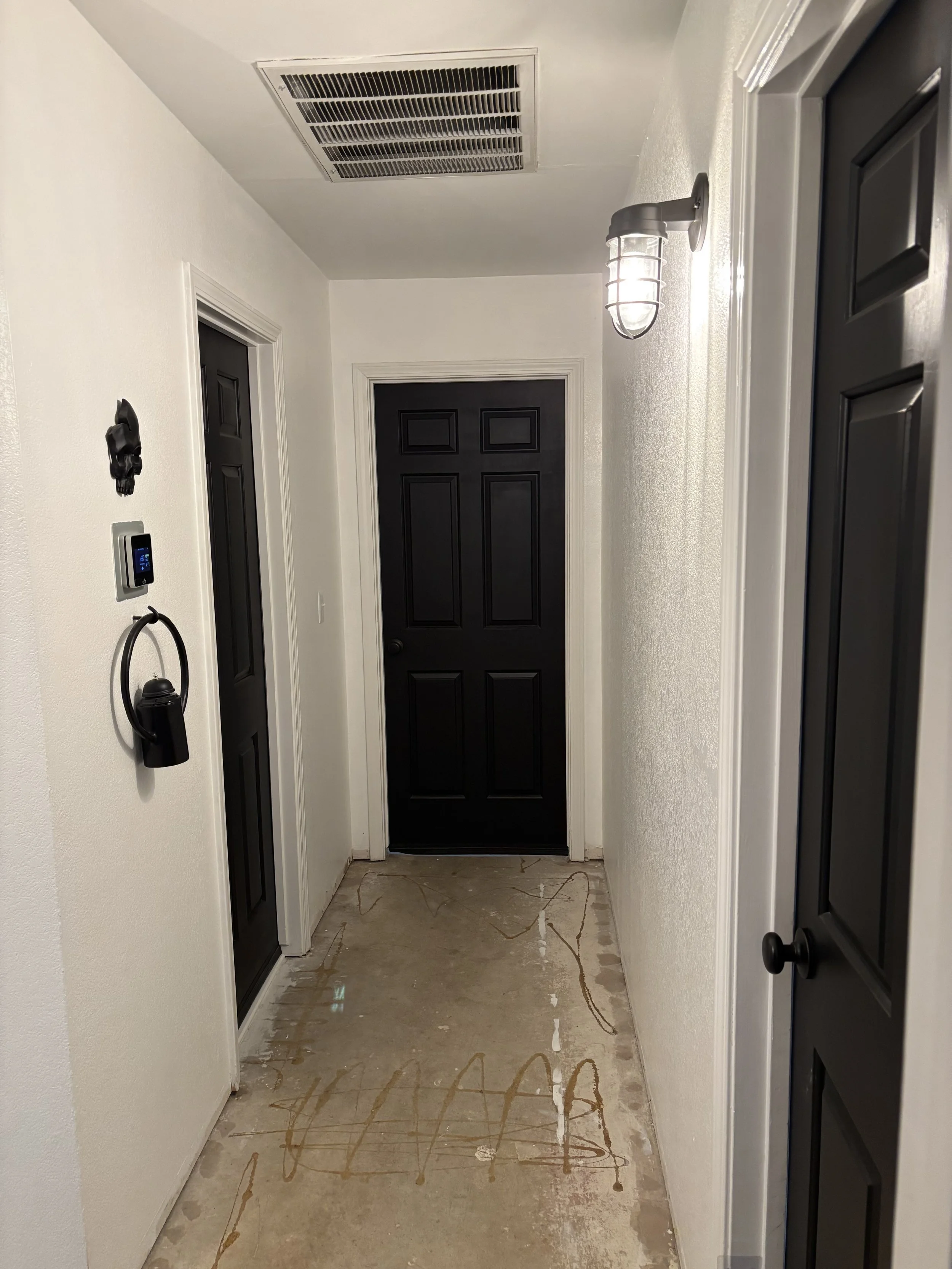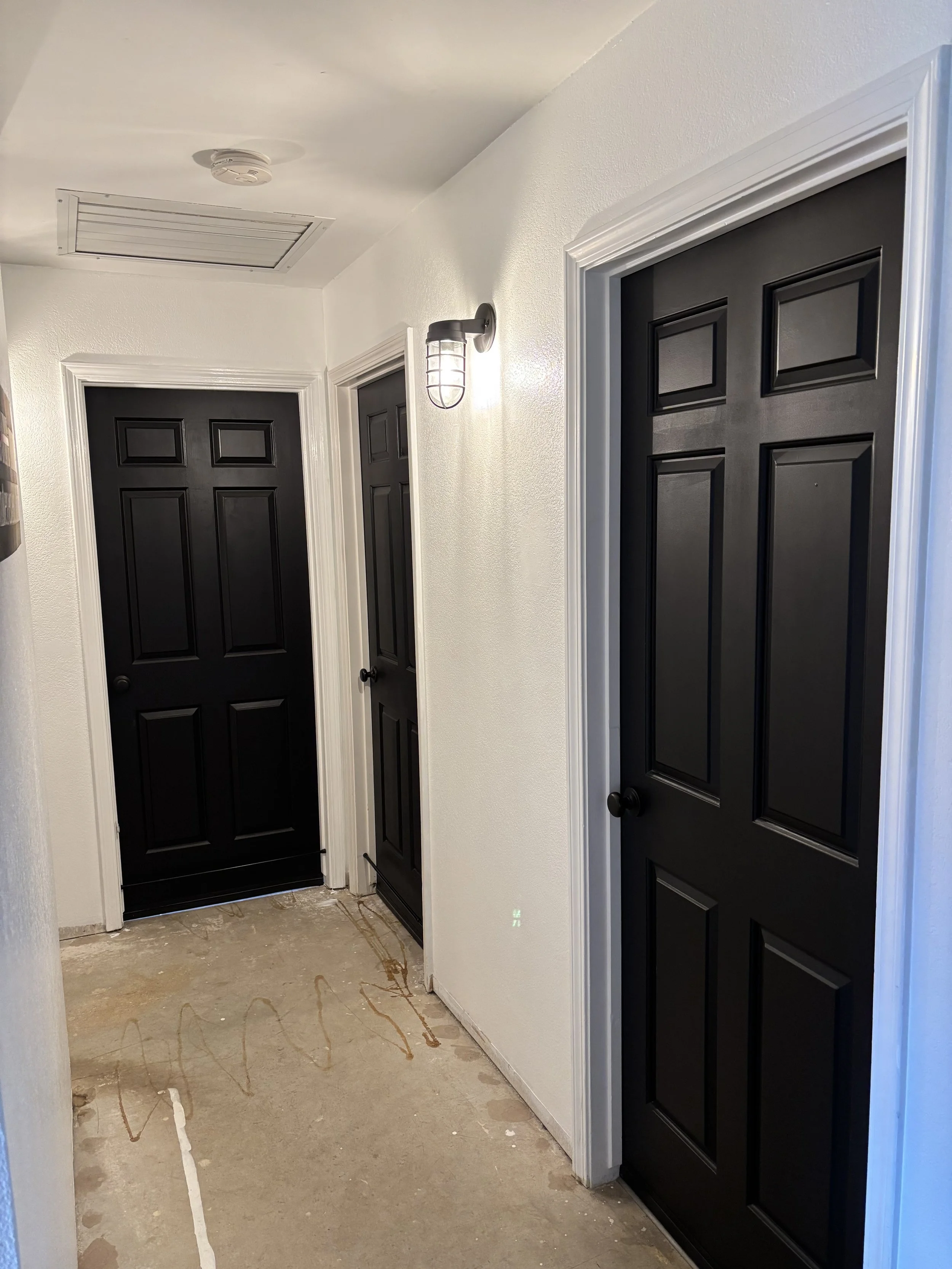 hall modernizationOur hall modernization project was born from my love of the color black, especially for design. Our goal was to make the hall feel larger, clean, and sophisticated. By removing all photos and art we decluttered the space. Painting the walls white helped give a clean, stylish feel against the stark contrast of the black doors. This was an inexpensive day project that modernized the space tying in our black color palate seen throughout other areas in our home. Finishing touches included changing the lighting to industrial cage lamps for a cool, institutional vibe.