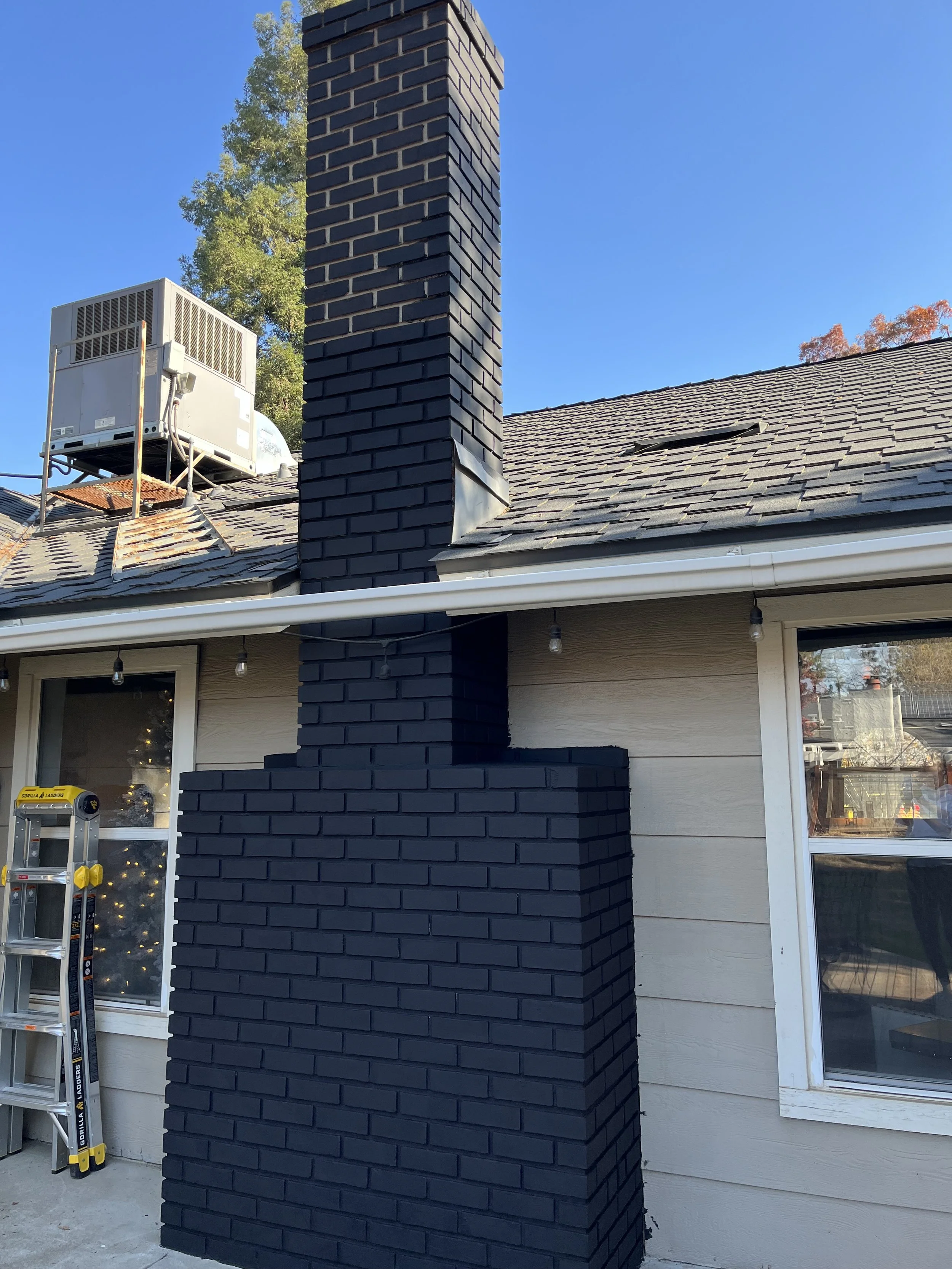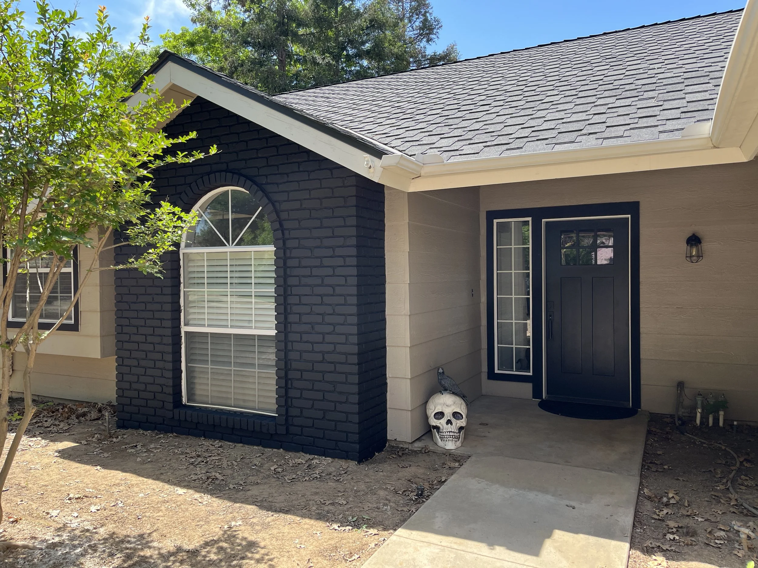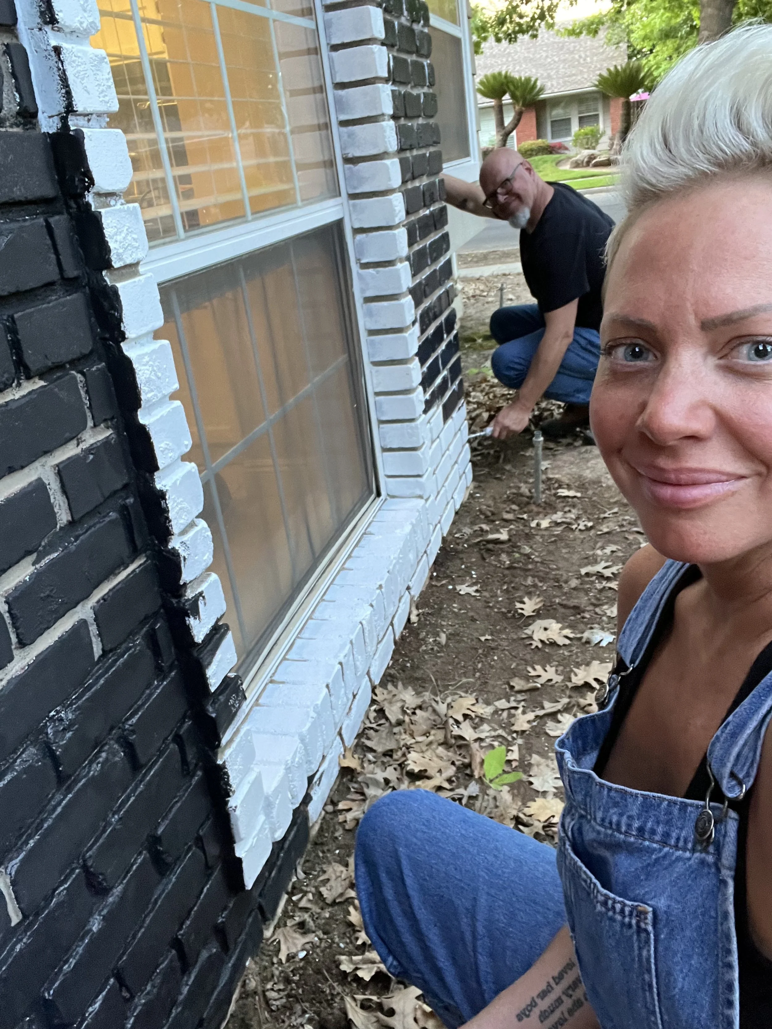 After we painted the bricks in the living room fireplace black it was only a matter of time and cooler weather before I did the same to the bricks on the front of our house and the fireplace/chimney in the back yard. We also decided to paint the trim around the front windows black. I knew changing these details would make our upcoming landscaping project POP once spring came. While we were working on our curb appeal, we also decided to replace the front door to match the front windows and painted it black to match the brick and trim. We were stunned with the results and adore our new edgy look.