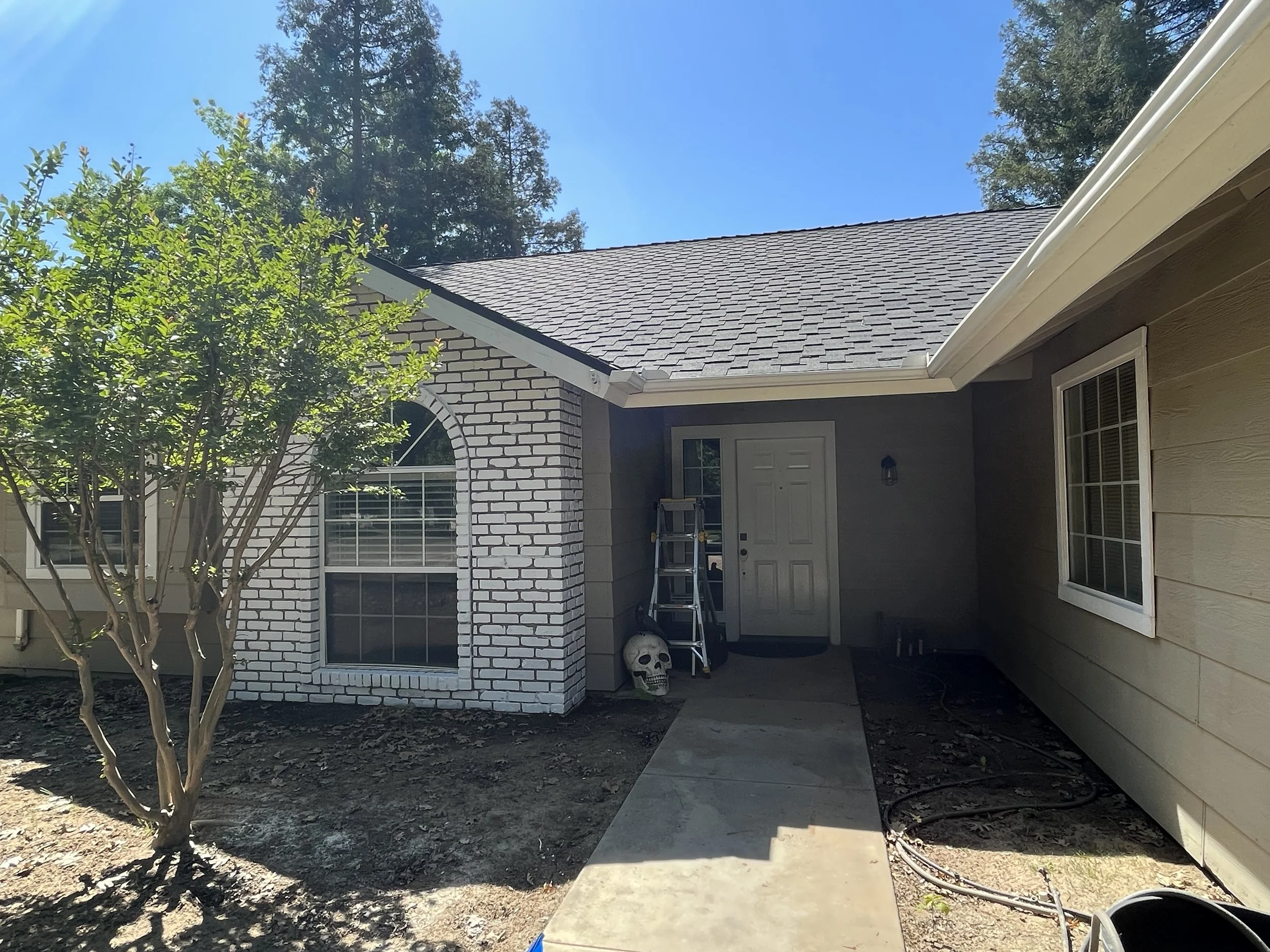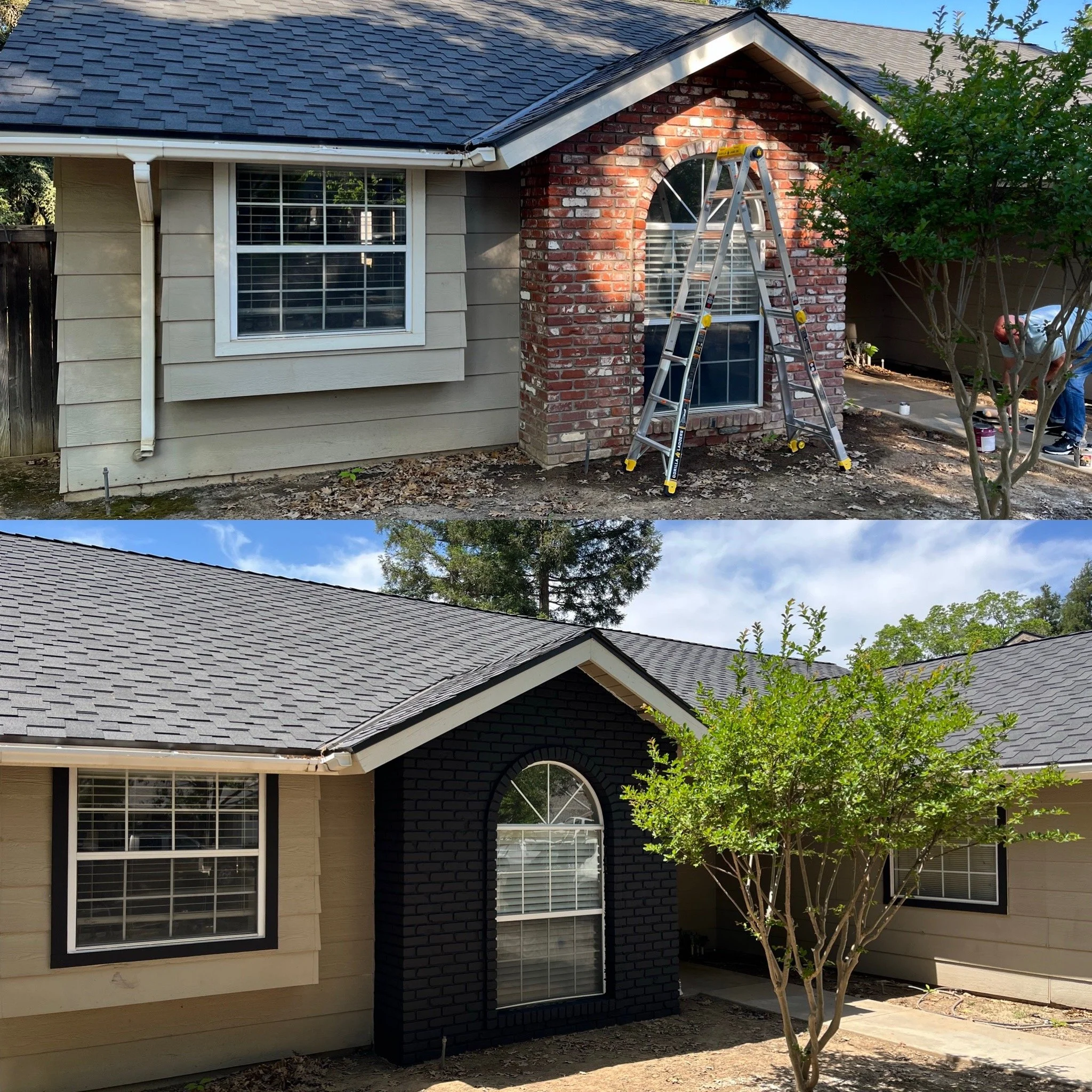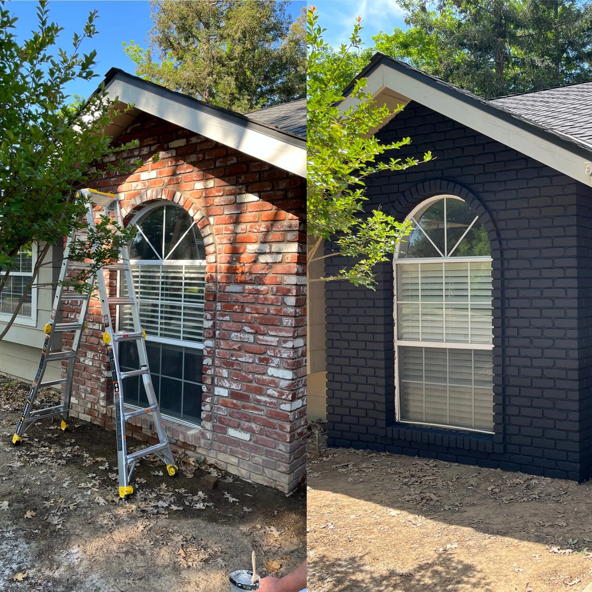 After we painted the bricks in the living room fireplace black it was only a matter of time and cooler weather before I did the same to the bricks on the front of our house and the fireplace/chimney in the back yard. We also decided to paint the trim around the front windows black. I knew changing these details would make our upcoming landscaping project POP once spring came. While we were working on our curb appeal, we also decided to replace the front door to match the front windows and painted it black to match the brick and trim. We were stunned with the results and adore our new edgy look.