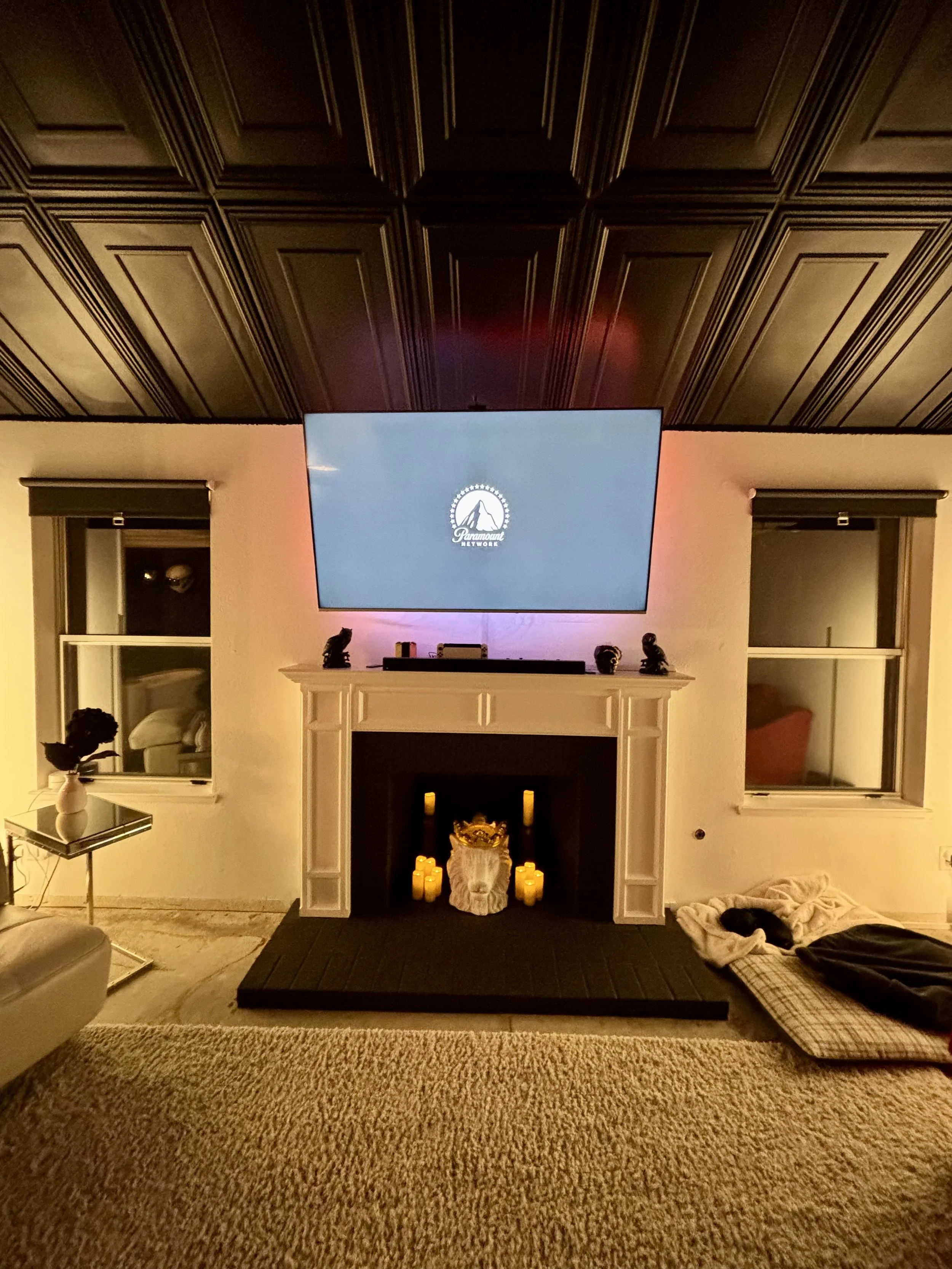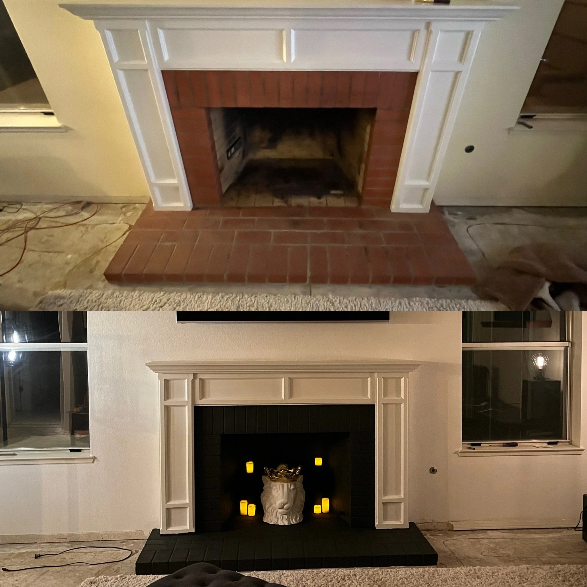 fireplace makeoverThe fireplace makeover was an idea we had after Jon enlightened me that there are certain days you’re allowed to have a fire due to air quality in the valley. Rather than have an ugly eyesore we could only use occasionally, we decided to create a stylish focal point for the area we spend the most of our time. We capped the gas line, thoroughly cleaned the fireplace, and got to work painting. We found the perfect bust to occupy our hearth, and remote-controlled candles finished the vibe we were looking for. This was a low-cost project that completely transformed the look and feel of our living room. It’s giving pride vibes.