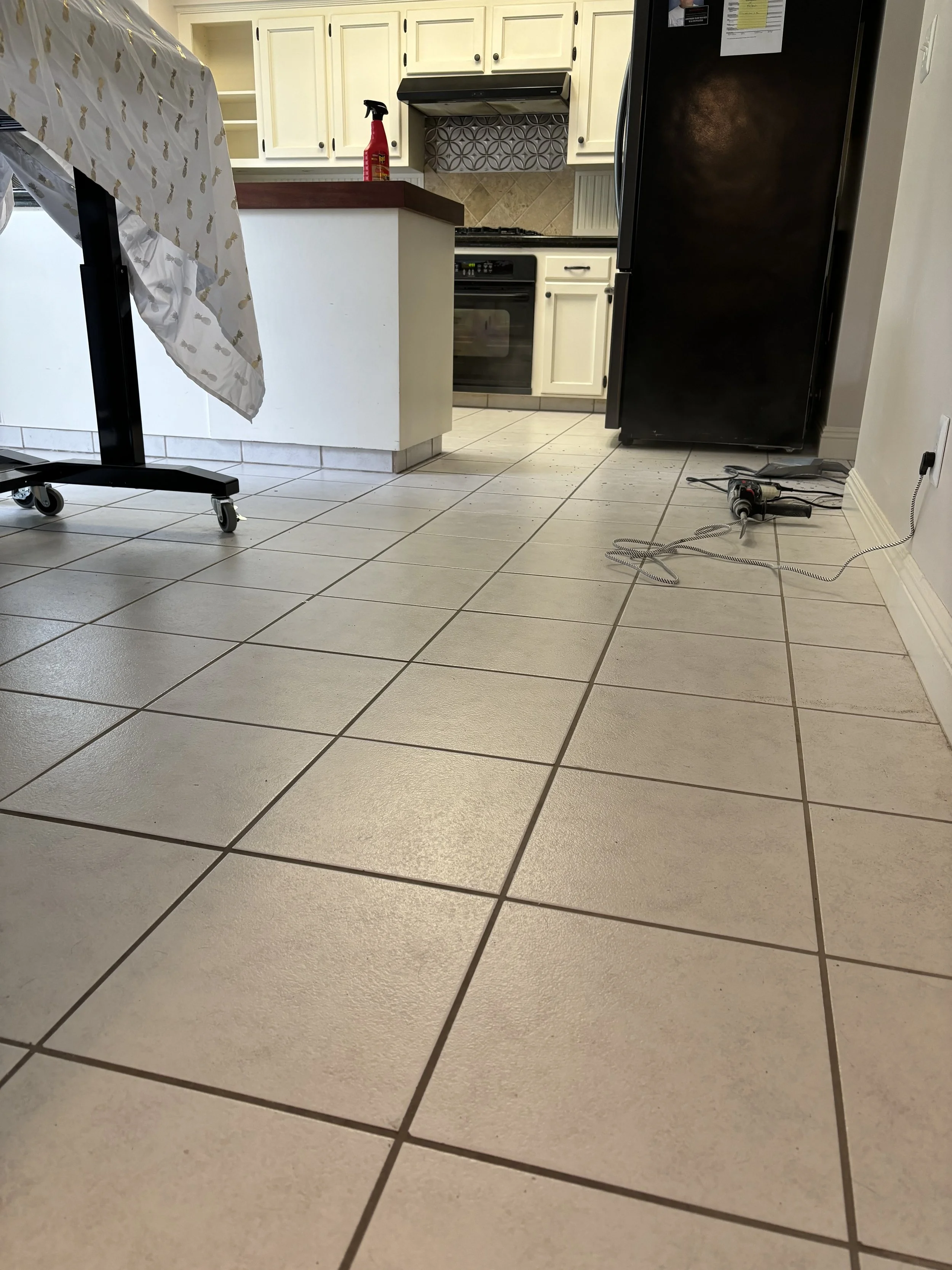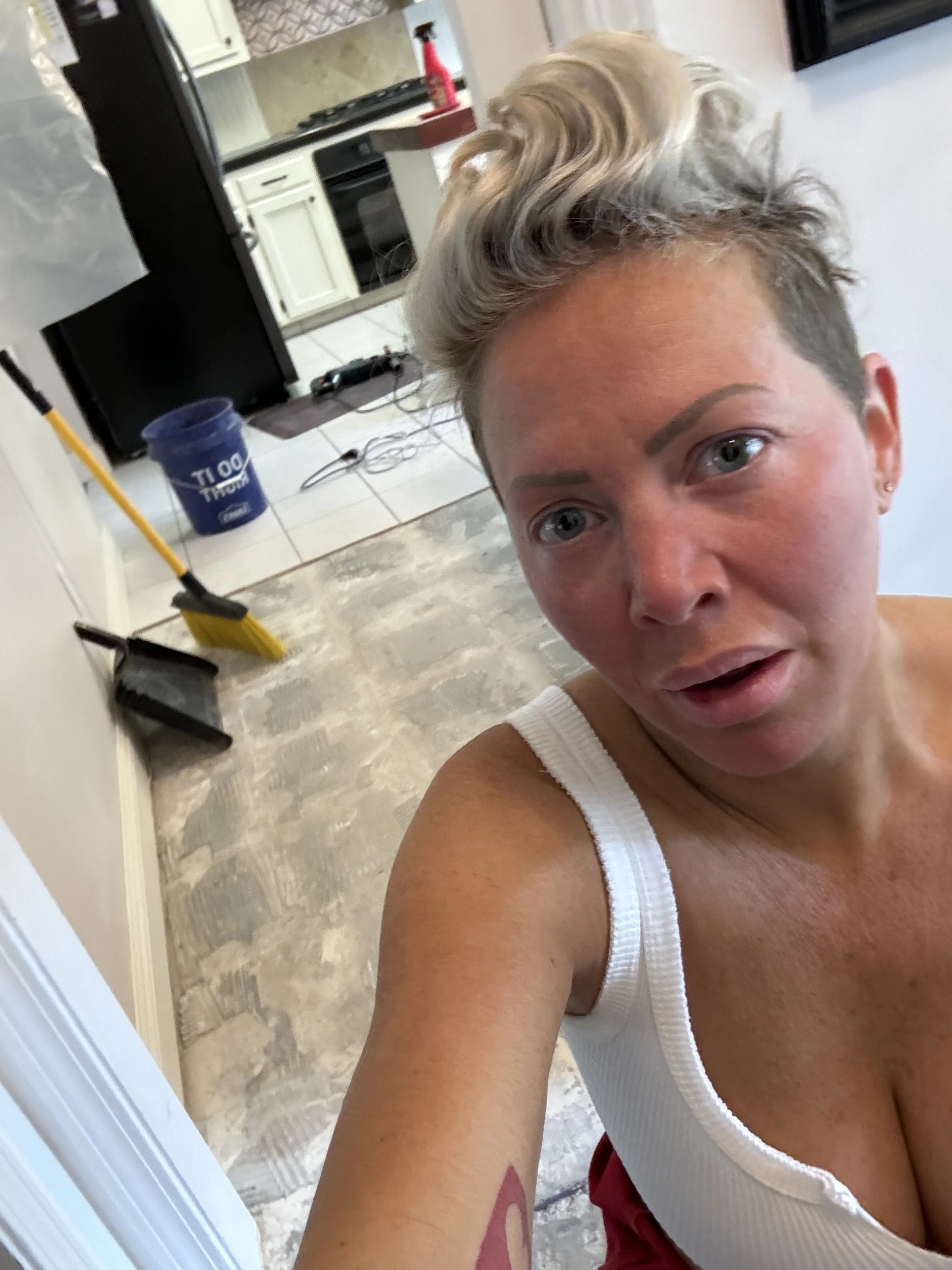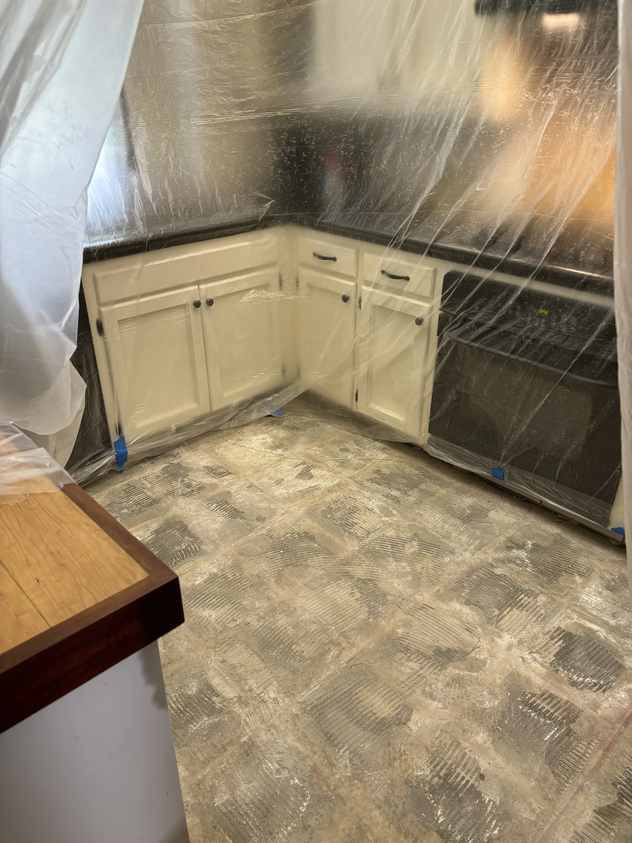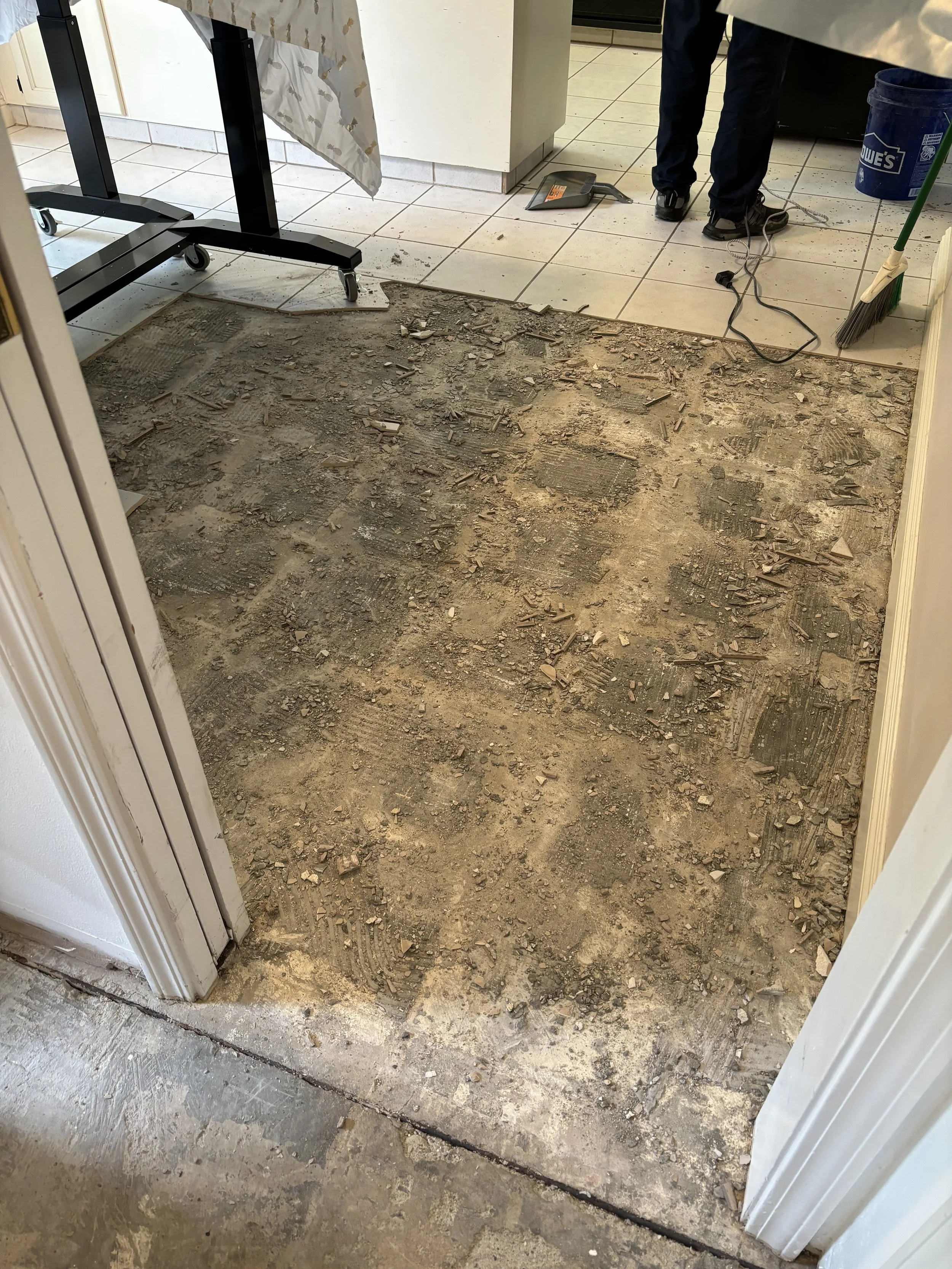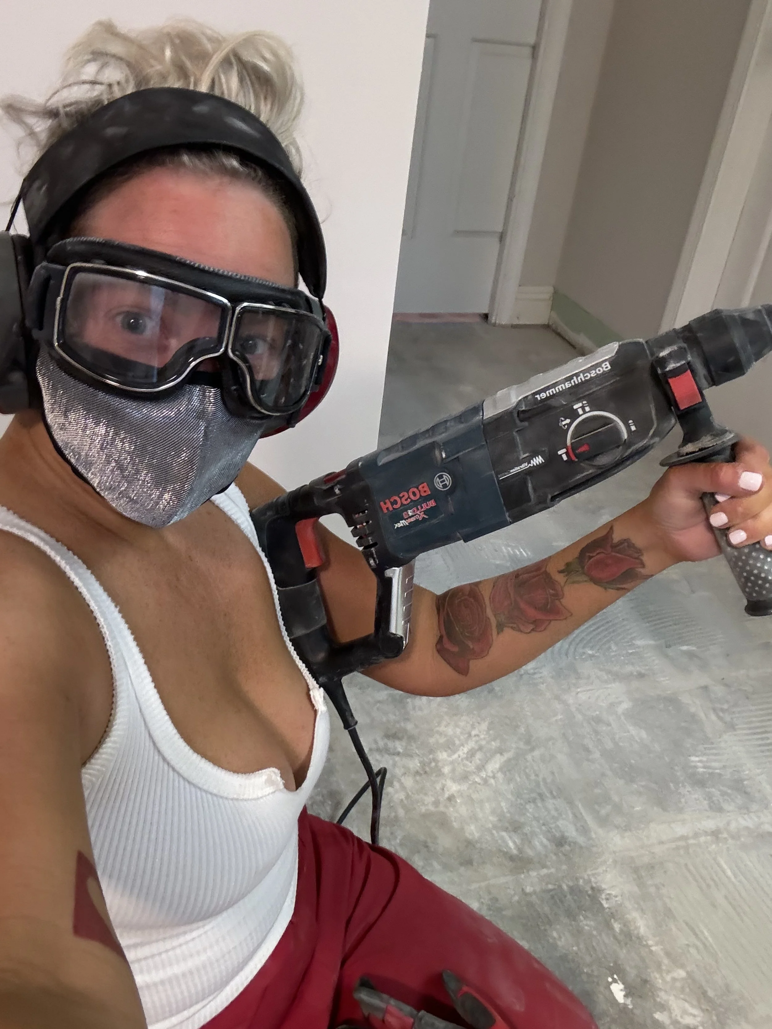 Kitchen Tile RemovalWhen we decided to remove the dated white kitchen tile, I didn’t realize how much time and effort the process would take. Initially, I thought the use of brute force with a sledgehammer and pry bar would be sufficient, after all it worked for the laundry room. Boy, was I wrong! Enter the Bosch Hammer Drill! Even with the hammer drill this was a project that took muscle. I’m glad the tile is out but for those looking to remove tile yourself, know you’re in for a few days of pain in muscles you likely didn’t know you had. I should also mention this process creates micro dust that gets everywhere so have a large fan to help suck it out a window and put up plastic sheeting to save yourself the chore of dusting and washing every surface in your house! Fun stuff.
