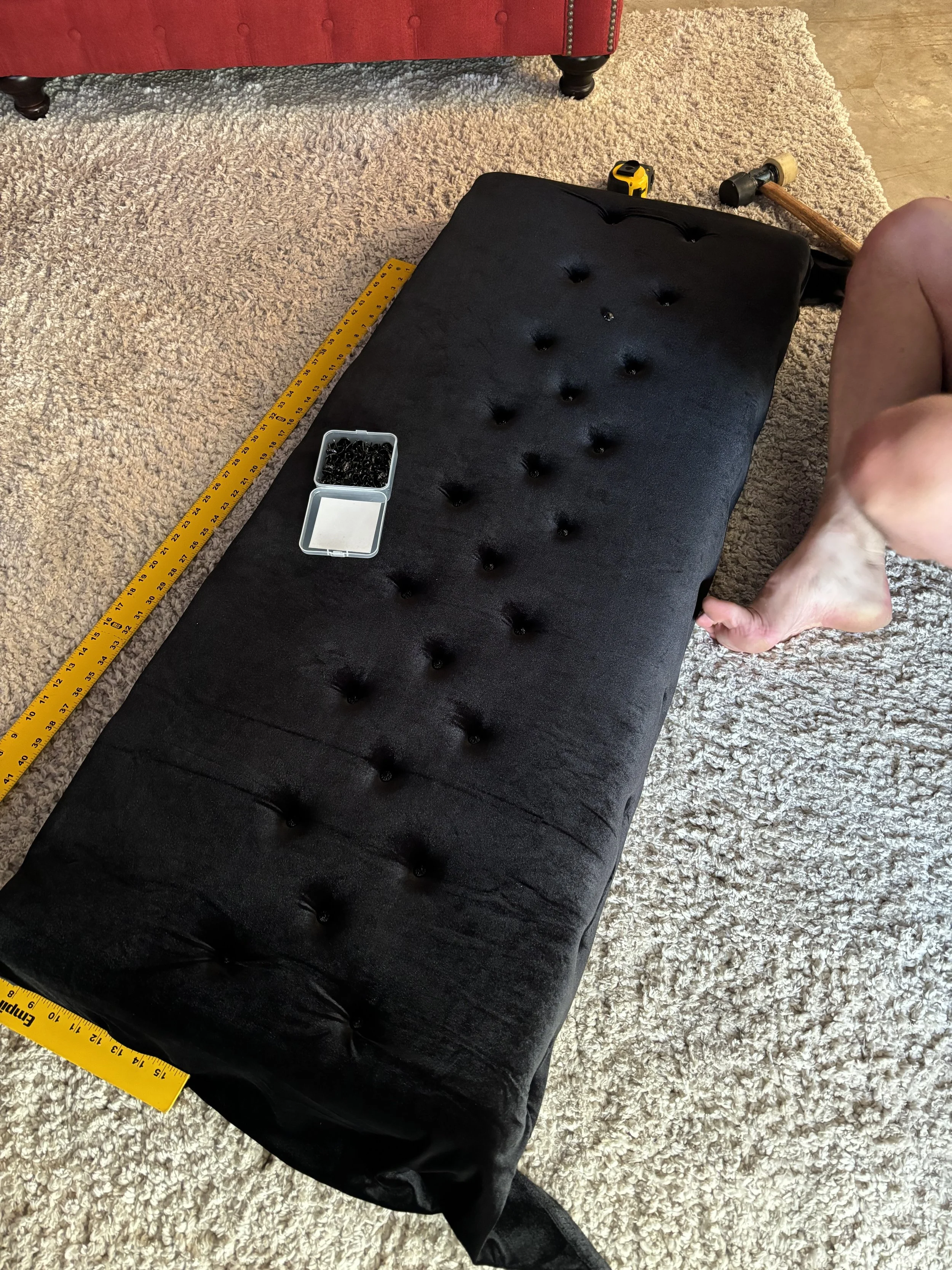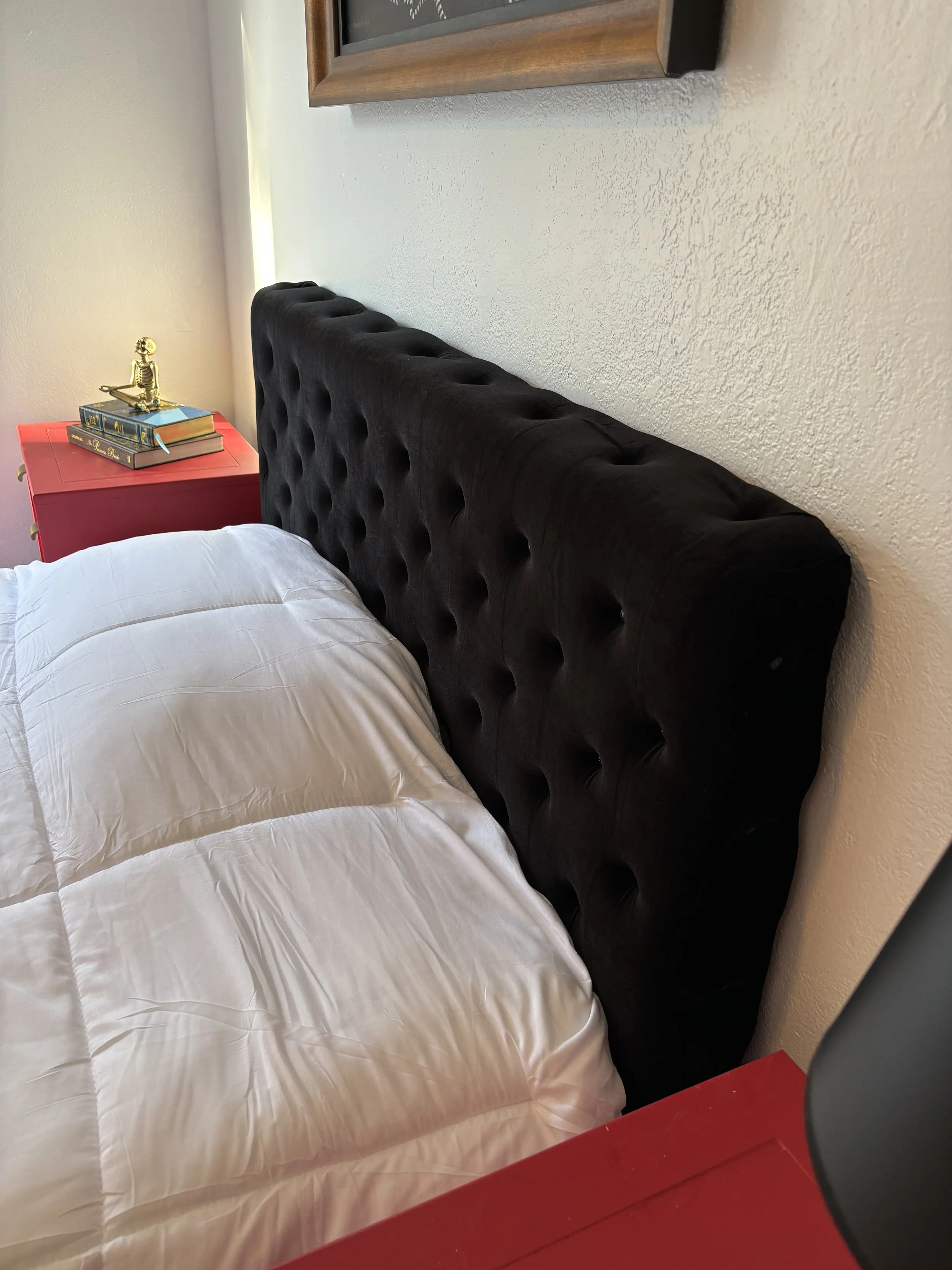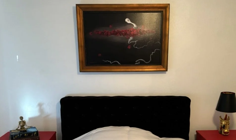 guest room + custom headboardOur guest room is, admittedly, a little macabre due to the dramatic colors, custom art by our brother James Naccarato, and other design details such as the gilded skeleton in ohm position sitting atop a hardcover of Edgar Allan Poe’s collective works on the side table. To create balance, and soften the overall feel of the room, we play with other details like the unicorn lamp, fur rug, and black velvet headboard. Clean white paint finishes the aesthetic and keeps the spotlight on the decorative details.