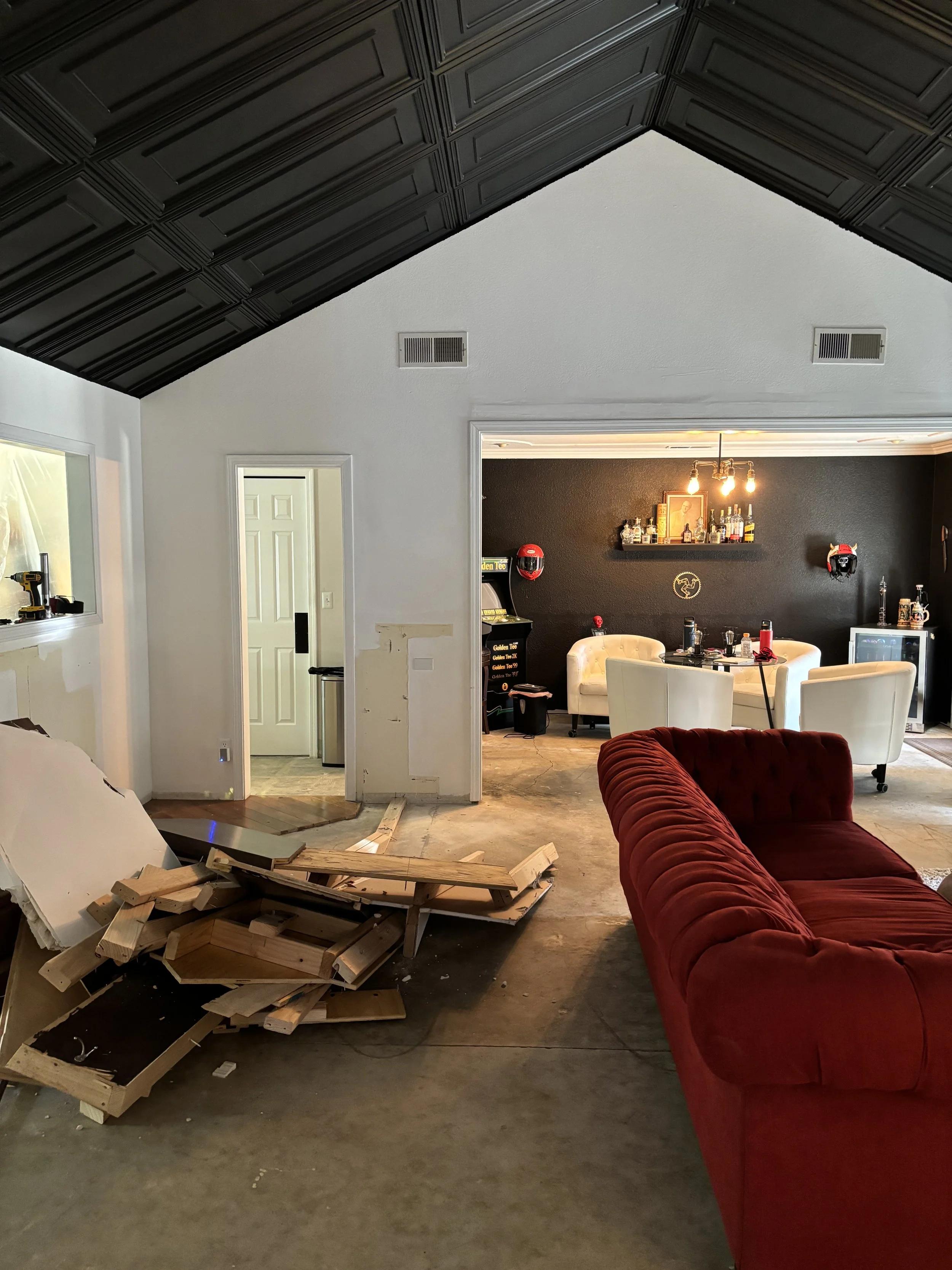 Now, before you think I’m heartless for looking so happy after I completely obliterated it, I think it fair to mention I designed and furnished our lounge as a replacement area for our friends and family to gather. Jon wasn’t ready to part with the bar so soon but Fresno’s annual Operation Clean Up had me feeling inspired to pick up my sledgehammer and get to work. BANG..POW..BYE!